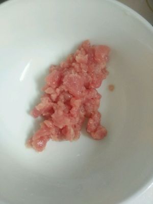 将猪里脊肉切成末,加入少许酱油(生抽老抽均可),料酒,拌匀,加少许面粉将水分锁在里面,再加入一点油,搅拌均匀。