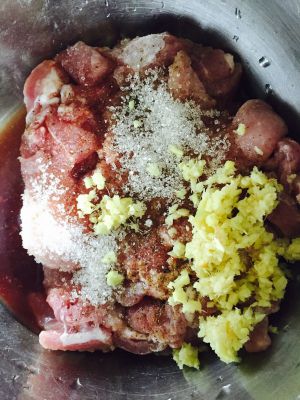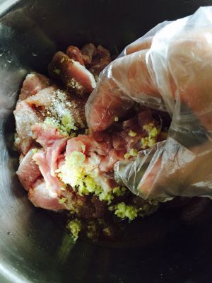 将切好的五花肉装入盆中 倒入生抽 盐 葱姜蒜 抓拌均匀后搁置10分钟。