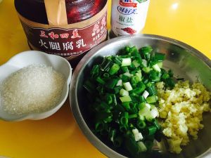 准备好腐乳汁、椒盐粉、糖、葱花、姜末(爱食辣的可以准备少许辣椒粉)。