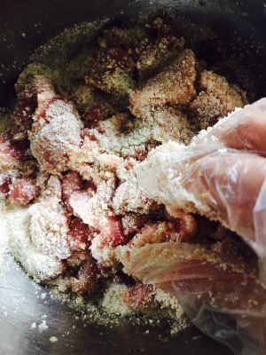 洒上买好的蒸肉米粉,可多洒些,拌均。