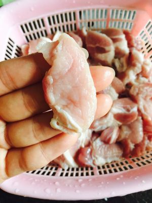 将五花肉洗净,切成0.6cm厚的小薄片。
