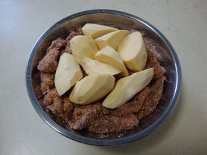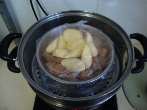 在碗底抹点清油,把肉码放整齐!上边放入切好的土豆块!上锅蒸大概 40分钟!