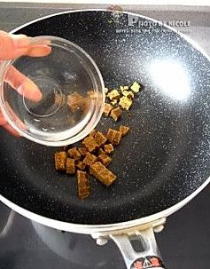 咖喱切碎,放入锅中,加入少许水,一边小火加热,一边搅拌,直至咖喱融化至粘稠状;