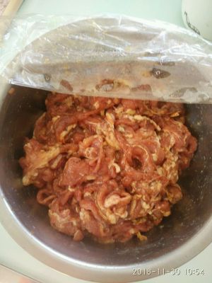 五花肉(排骨,瘦肉都可以)切片 重口味的可以,加几个姜颗颗,一勺豆瓣,一勺生抽,一勺老抽上色,搅拌均匀。粉我用的孔师傅麻辣蒸肉粉,好吃的! 不想麻烦的,直接粉加肉就可以了,只是整出来会颜色淡点,味道淡点