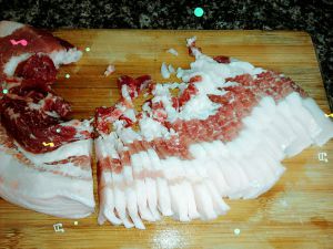 猪五花肉(500g)、大米(100g)、糯米(50g)、腐乳汁(30ml)、白糖(15g)、生抽(30ml)、五香粉(3g)、白胡椒粉(1g)、姜(30g)、香油(15ml)、花椒(5g)、八角(10g)、桂皮(10g)、香叶(1g)、白酒(30ml)、盐(2g)、老抽(5g) 1、选择肥瘦相间的五花肉一块洗净。 2、切成略厚一点的大片。【可以先放冷冻室冻硬再切】