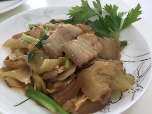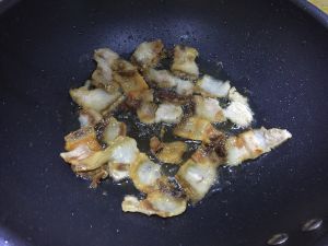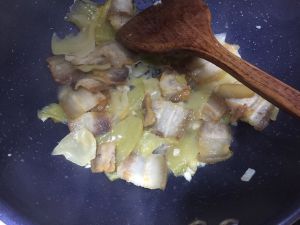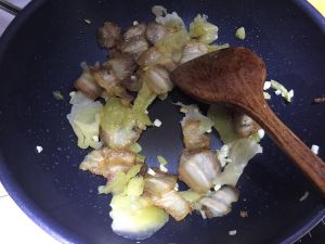 热锅,倒油,少点,因为待会儿我们要煸五花肉,内里也有油,要健康么,少油。小火煸炒,你会发现锅里油会慢慢多出来,当心油锅爆锅,等到肉有点煎黄了,倒入切好得包心菜,不断翻炒。