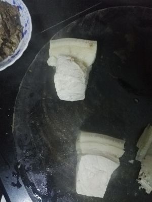 首先买回来的新鲜五花肉要在开水里煮熟,开水里倒两勺料酒,一个八角,几片姜,一个桂皮去腥。煮好后拿出来晾凉。因为这是我上次处理好的五花肉,所以今天就没有详细细节图。下次单开一贴补上。