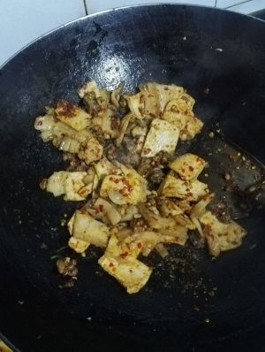 肉先煮一下,捞起来切片,锅里倒油,油冒烟,先放姜,花椒,然后放辣酱,辣酱差不多干一点,倒入切好的肉。