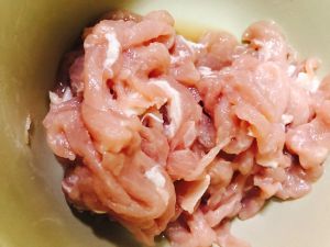瘦肉切丝,放苕粉、水,少许盐,用手搅拌。可以多用手捏捏,这样肉更嫩。