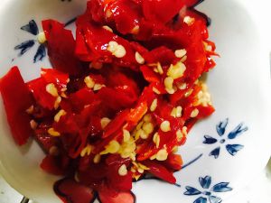 泡姜泡椒切末。一定要选点红色的,这样炒出来的鱼香肉丝才好看。