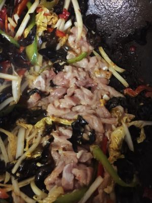 倒入切成丝的 木耳 青红辣椒 白菜翻炒