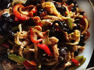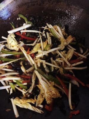 顺次放入葱姜沫,胡萝卜丝、青椒丝、木耳丝,迅速翻炒。