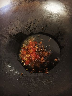锅中倒少许油,放入郫县豆瓣酱炒出红油。