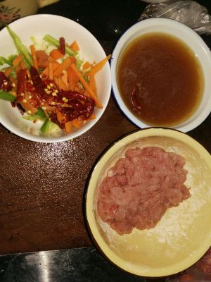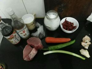 土豆、胡萝卜、青椒都切丝。 肉切丝。 朝天椒和葱切小段。 准备好各种调料。