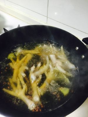 锅里加入清水 放花椒 香叶 八角 煮香后放鸡爪 煮开加入一勺醋 一勺料酒 一勺生抽 几片生姜 煮熟