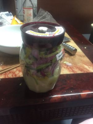 加入自己喜欢的菜,如黄瓜,洋葱,芹菜,胡萝卜等,一起浸泡,菜易入味,3小时内可吃