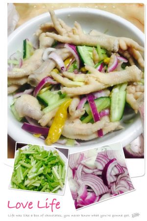 鸡爪切三段,放入锅中煮10分钟左右,煮好在冷水中冲,沥干水后,放入泡椒水中。根据各人口味,适当添加调料!