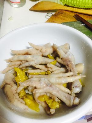 把煮好的鸡爪过冷水 过2遍 然后用白开水过一遍 沥干水 放进准备好有泡椒的碗里 放置入味即可食用