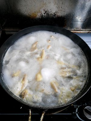 切掉指甲,放入锅内。加入姜片料酒些许