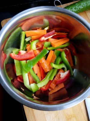 菜椒、胡萝卜洗净切成条;