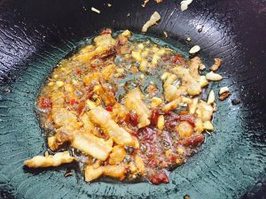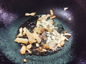 肥肉下锅爆出油后,加入蒜末爆出香味