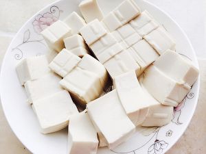 豆腐切5厘米大小正方形块,热水加盐烫一下
