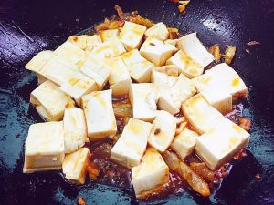 油热后,放入葱姜蒜炝锅,倒入备好的肉馅。肉馅翻炒变色后加入豆酱(个人不喜欢吃郫县豆瓣酱,所以用的是黄豆酱。感觉味道更香)辣椒酱。各种酱的多少根据自己口味放,翻炒均匀后就可以倒入豆腐了。继续翻炒后加入酱油,盐