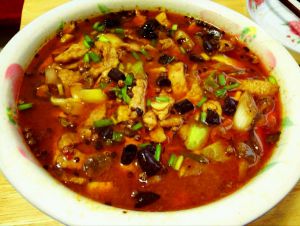 莴笋尖,豆芽放入锅里, 煮到断生即可~~~~~ 把菜捞入另一个碗中铺在碗底,肉片倒入锅中的汤中煮1分钟后, 连汤带肉倒入铺有蔬菜的碗中~~~ 这时在上面洒上超多的辣椒面 \(≧▽≦)/ 当然, 因人而异哈! 小女子我重口味, 你懂的~! 哈哈。 这边另起锅,倒入比平时炒菜稍多的油,等油温上去了后关火~~~激动人心的时候可到了!!! !! 哈哈 , 把油倒在辣椒面上~~~~ 这时候会发出“兹兹”的声音~~~激动啦!! 哈哈哈。 注意不要烫伤手。