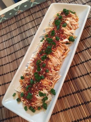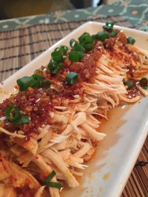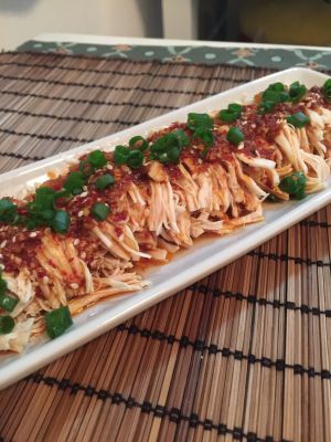 取一碟子,把晾凉的鸡肉撕成一条条摆好盘,这个我忘了拍,自己吃随便撕都可以,浇上调好的辣椒油,再撒上葱花活着香菜,这个也是看个人喜欢,这样就可以上桌啦,简单又开胃
