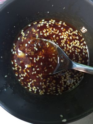 花生用粉碎机打碎,加入自制的辣椒油两勺,白醋一勺,芝麻少许,辣椒油一勺,花椒油1勺,花生油1勺,盐小半勺,糖小半勺,花生碎1勺(如果家里没有粉碎机可以不加,只是个人觉得加了花生碎会比较香一点)搅拌均匀备用 自制辣椒油看我发表的菜谱有