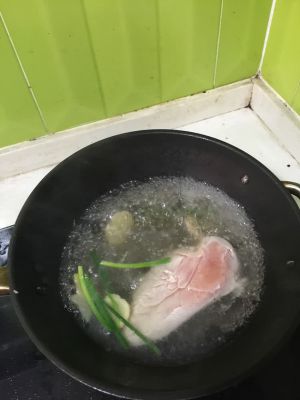 取一锅加水放入姜片,葱段盖锅直到水开后放入鸡胸肉