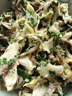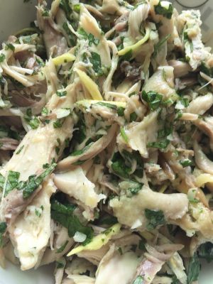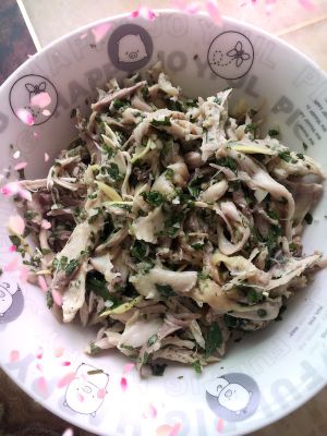 鸡剔除骨头,鸡肉撕成条,加入生抽、蒜泥,小米椒,姜末,少许醋,花椒油,拌匀最后撒一点香菜,点缀增香就完成了。