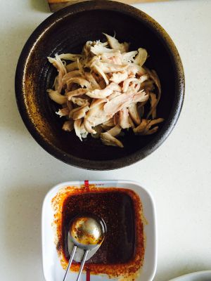等鸡腿冰凉之后,就把鸡腿肉撕成一条一条的,装在盘子里。