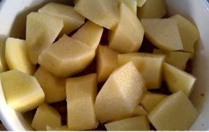 土豆切滚刀块码在五花肉上,再加入少许清水在,这样的话肉蒸熟时入口绵软适口