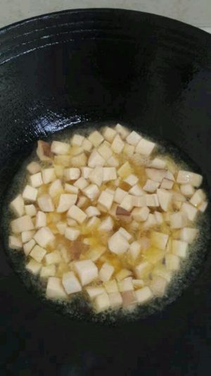 锅烧热,倒多一点油。下入鸡丁,中火翻炒。