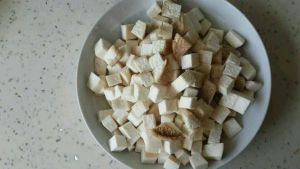 鸡胸肉切丁,加入油、淀粉和蚝油拌匀腌一会。