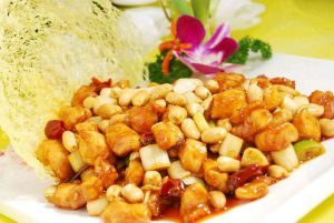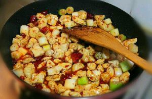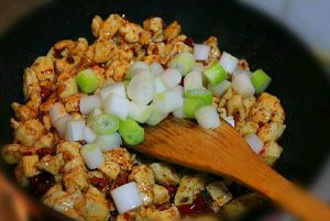 之后加入鸡丁跟花生,鸡肉变色时,用少许蚝油、醋、糖调味。
