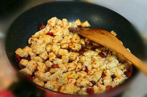 锅中放油,放入花椒,煸炒出香味后将花椒捞出,依次放入葱碎、蒜碎、干红辣椒碎、自制辣椒酱(或者郫县豆瓣)翻炒出香味后放入八成熟的鸡丁与胡萝卜继续翻炒1分钟。