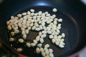 凉锅中放入少许油,然后将花生放入锅内煸熟。