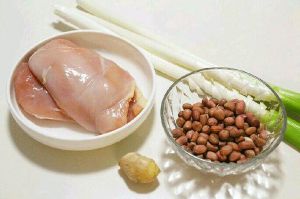 鸡胸脯肉切丁,莴笋切丁(可用胡萝卜等水分不大的食材代替)辣椒剪段,葱白切段。