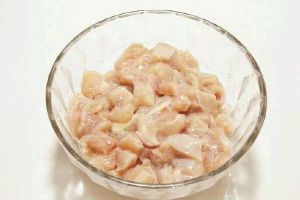 鸡胸肉切丁,放入生抽、盐、料酒与水淀粉拌匀。鸡腿肉也可,不过需去骨。