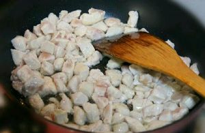 将锅烧热,然后倒入适量食用油。接下来再把鸡胸肉放入锅中,迅速打散。鸡肉表白即可盛出备用。