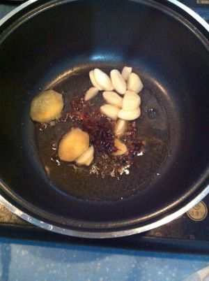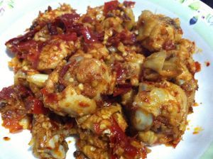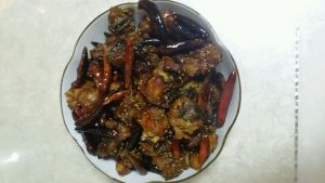 锅里烧油至7层热,倒入姜蒜炒出香味后倒入干辣椒和花椒,翻炒至气味开始呛鼻,油变黄后倒入炸好的鸡块。