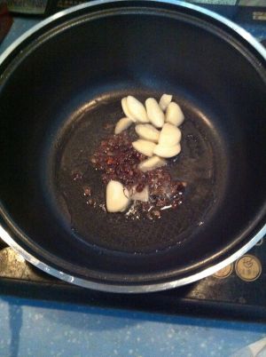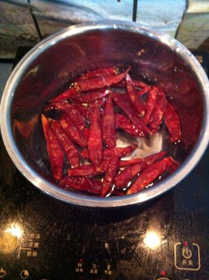 热锅放油,陆续加入花椒、大料、干辣椒和葱花。
