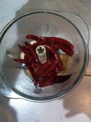 干辣椒和葱切成3厘米长的段,姜蒜切片。