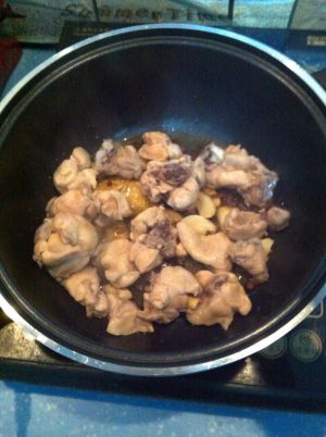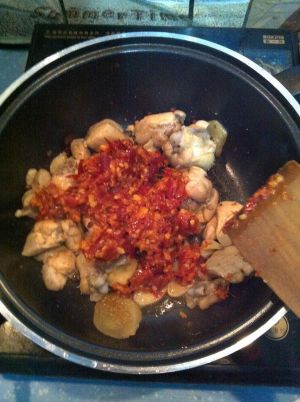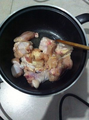 另起一口油锅,放入鸡块翻炒,一定要炒至表面焦黄,期间加盐和味精,