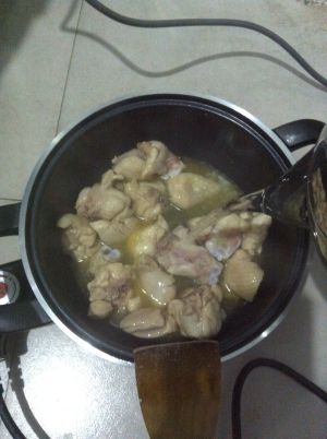 锅内多放一些油,将鸡肉炸至金黄色捞出备用。