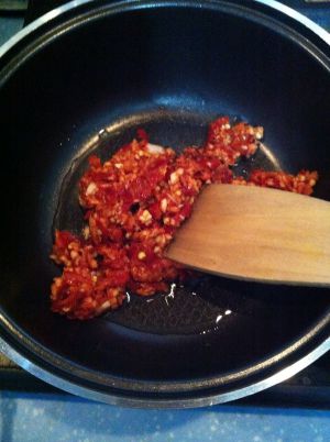 搅拌好的辣椒放入油锅,加点盐炒至变色