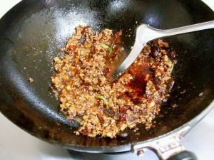 锅烧热,入油,油温7成热时,放入肉末炒出香味。