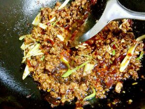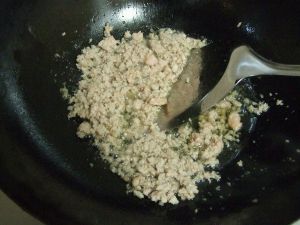 油入锅加热至六成热,转小火,肉馅下锅炒散。